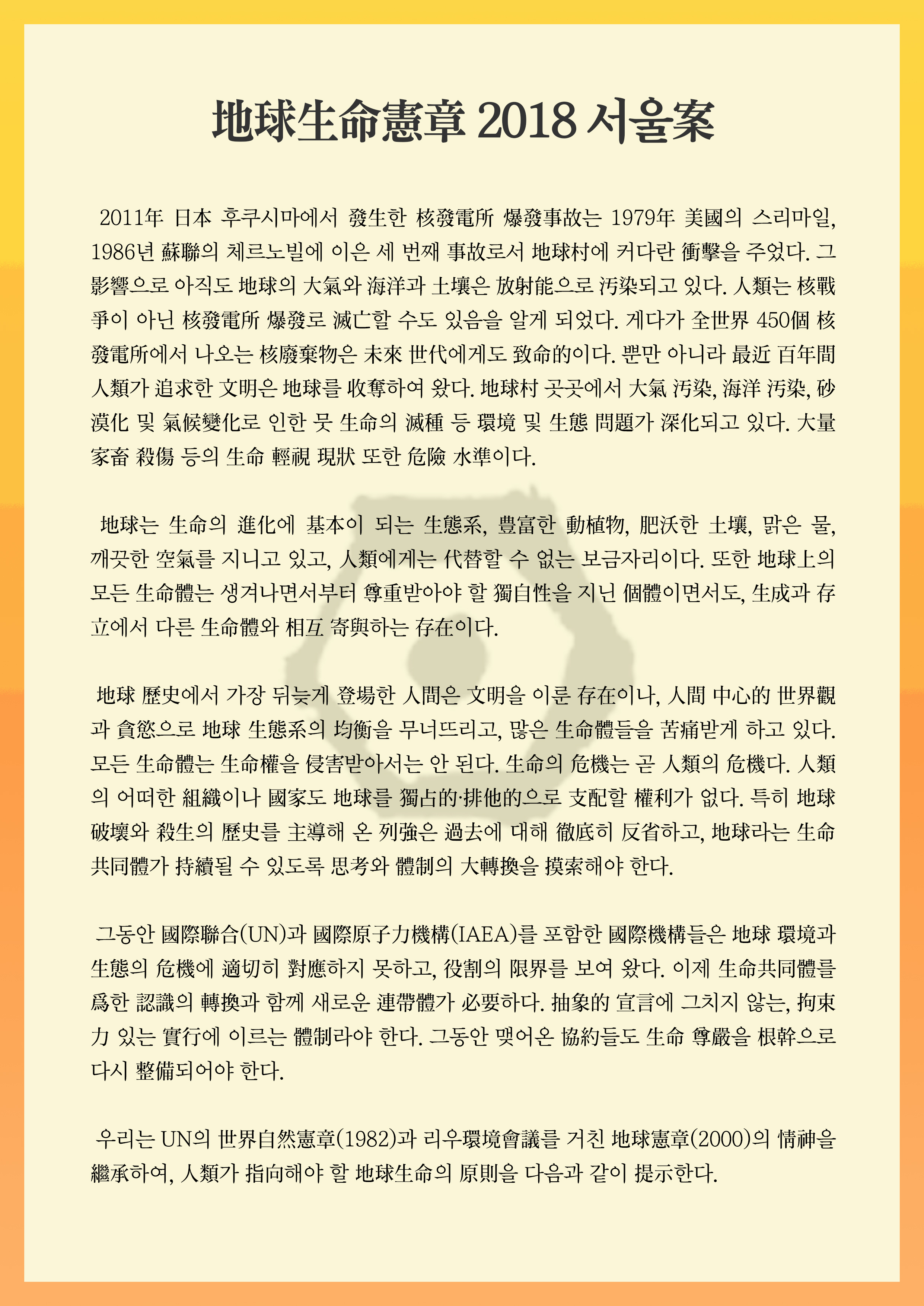 The 2018 Seoul Draft of The Charter on Earth-Life(Korean, Mixed Chinese text) By liferoad.org on December 23, 2018 • ( 0 ) Share this: Click to share on X (Opens in new window) X Click to share on Facebook (Opens in new window) Facebook Like Loading...‹ Liferoad 2nd Schedule / India Course2018-12-22~23 Restarting ›Categories: Meterials