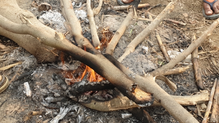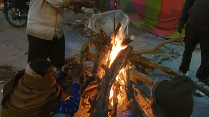 7. I took a picture of a group of people warming themselves at the bonfire.