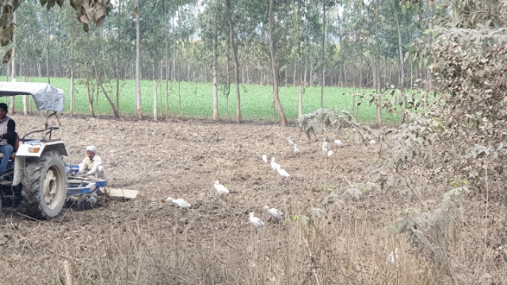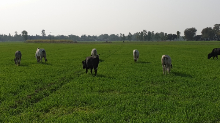 22. Wandering cattle graze in green wheat field. Nobody stops them.