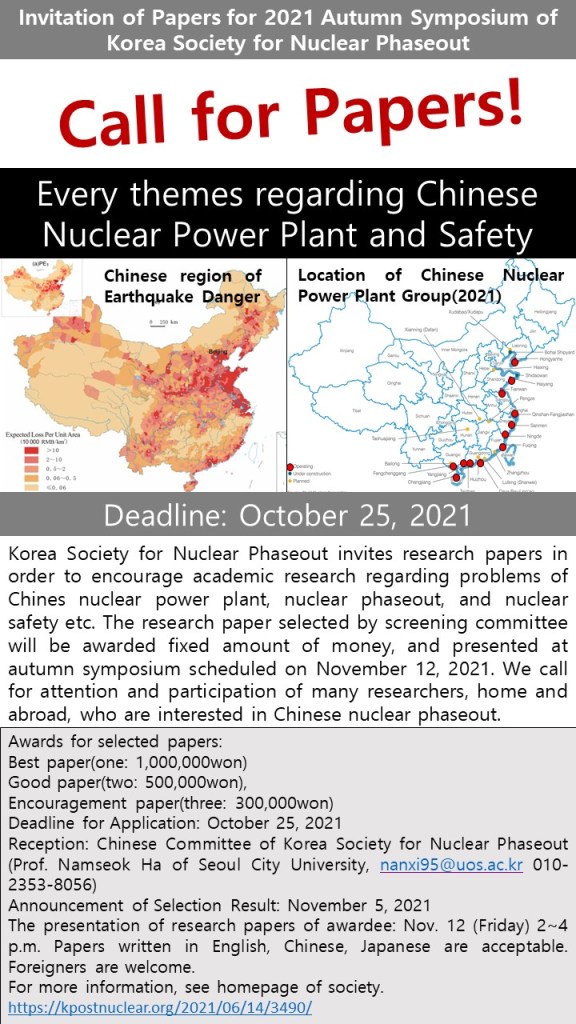 Korea Society for Nuclear Phaseout invites research papers in order to encourage academic research regarding problems of Chines nuclear power plant, nuclear phaseout, and nuclear safety etc. The research paper selected by screening committee will be awarded fixed amount of money, and presented at autumn symposium scheduled on November 12, 2021. We call for attention and participation of many researchers, home and abroad, who are interested in Chinese nuclear phaseout.
