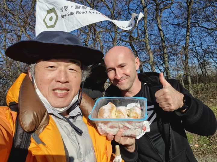 25. A car was waiting for me in the distance. The driver got off and gave me bread. He said his mother made the bread by herself. It was a touching scene.