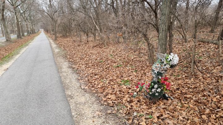 4. Next to the forest road, there is a bouquet at a tree probably to remember someone.
