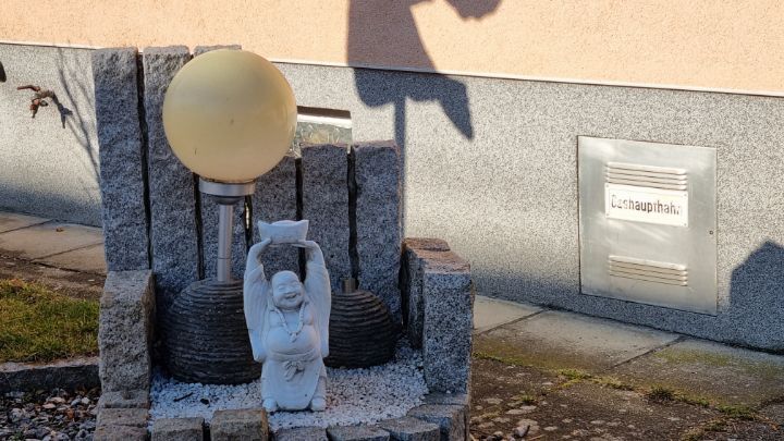 7. Entering the residential area, I saw a sculpture in yard which was made of miscellaneous stones.