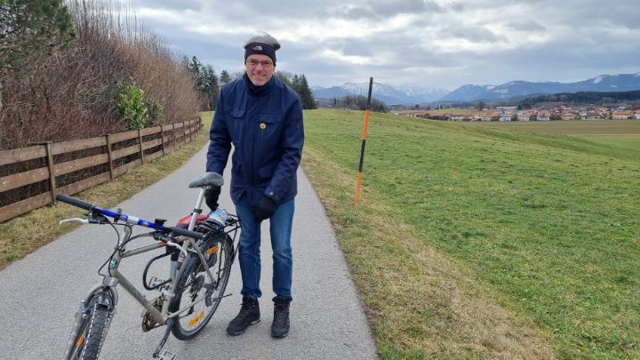 16. While walking, Mr. Müller personally picks up scattered trash and keeps it behind his bicycle.