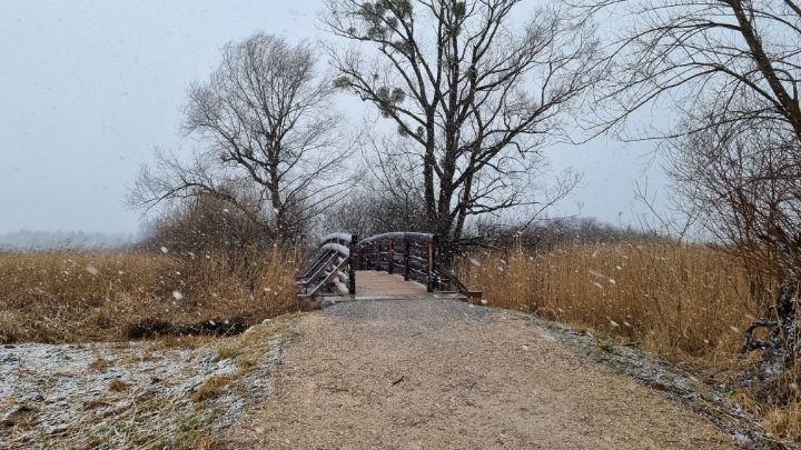 4. Wet snowflakes cover the lake road.