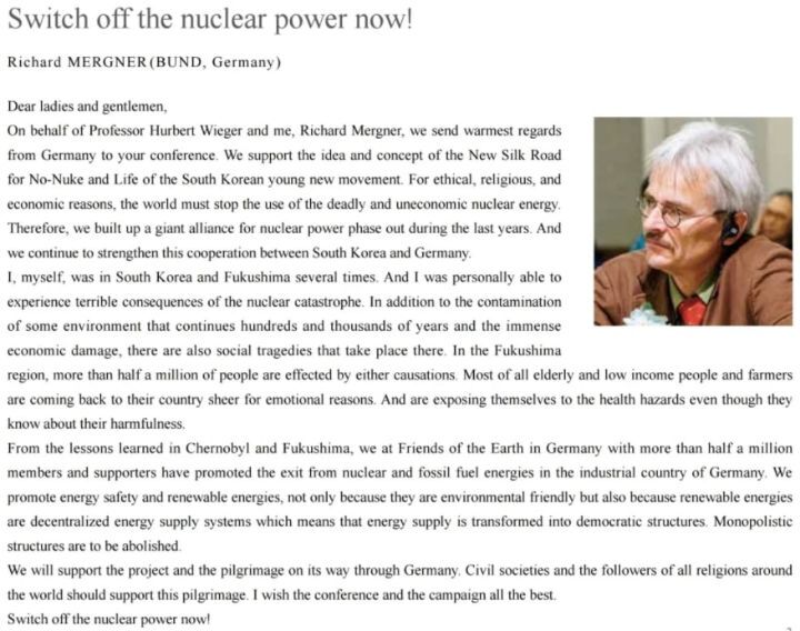 On behalf of Professor Hurbert Wieger and me, Richard Mergner, we send warmest regards from Germany to your conference. We support the idea and concept of the New Silk Road for No-Nuke and Life of the South Korean young new movement. For ethical, religious, and economic reasons, the world must stop the use of the deadly and uneconomic nuclear energy.