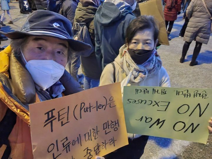 37. The slogan which I suggested was “Putin! Stop atrocities against humanity immediately!”. Ms. Hamclair wrote the slogan in Korean by herself.