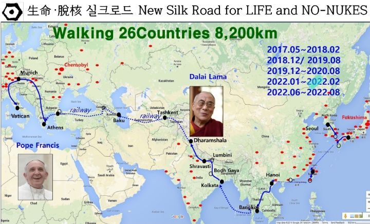 A) Under the slogans of 1) cherishing life and 2) nuclear power phase-out, this is a campaign-type event that aims to meet major religious people by pilgrimage to the global village on foot. The pilgrimage leader, Professor Wonyoung Lee of Suwon University, left Seoul in May 2017, when he was dismissed, and walked 5,000 kilometers in 10 countries to meet the His Holiness Dalai Lama. After that, then crossed the desert country by train to see the Orthodox World Patriarch Bartholomew I in Istanbul, After that, it has arrived in Munich, Germany as of February 2022, via Eastern European countries from Athens, Greece. So far, I have walked over 7,000 kilometers in 23 countries. This summer I will walk 1,200 km across the Alps to reach the Vatican.