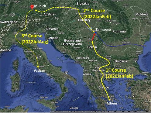 So, after walking 5,000 km, I met the His Holiness Dalai Lama in February 2019, and in the summer of that year, Middle Eastern countries traveled by train and met His Holiness Patriarch Bartholomew in Istanbul in August. After that, for two months in early 2020, I started walking from Athens, Greece, and walked about 1,000 km to North Macedonia, Bulgaria, and Serbia, and then stopped for two years due to COVID-19. After that, for two months in early 2022 this year, I walked about 1,000km to Munich, Germany, through Romania, Hungary, Slovakia, and Austria.