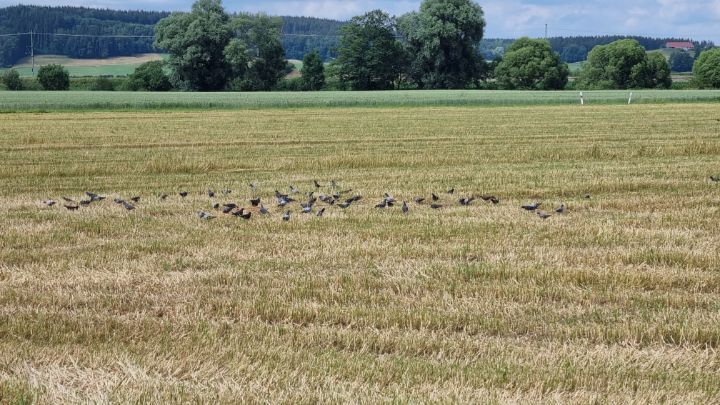 36. Pigeons flocked for gleaning in barley-harvested field.