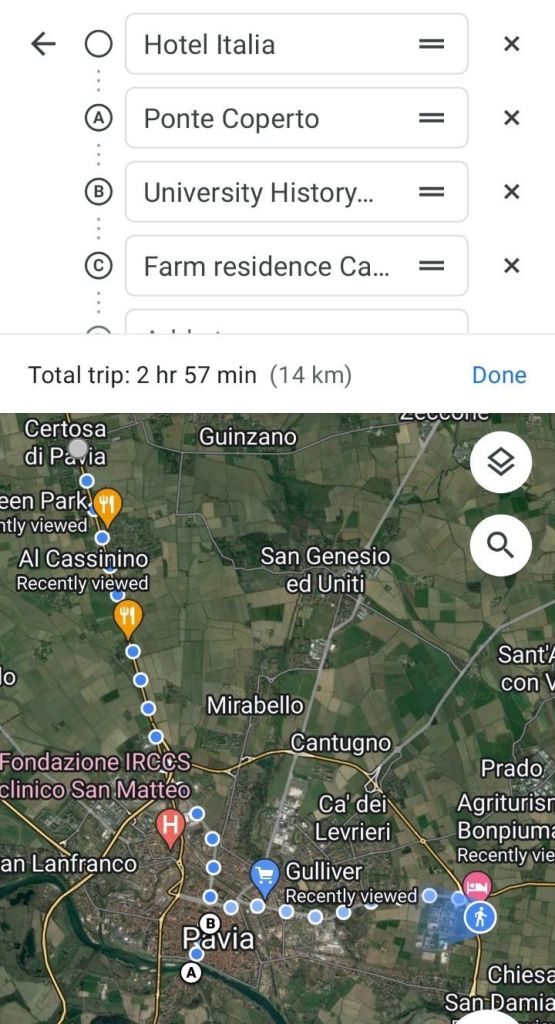 3. Today, I will walk only 14 kilometers to see the city of Pavia and the fields nearby.