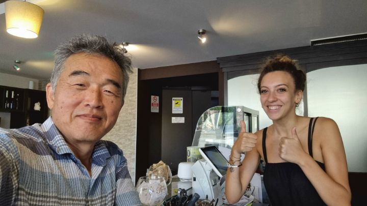 19. Residents of this country often eat breakfast at the bar. At a bar, I took a selfie with a beautiful manager who was curious about the K-traveler.