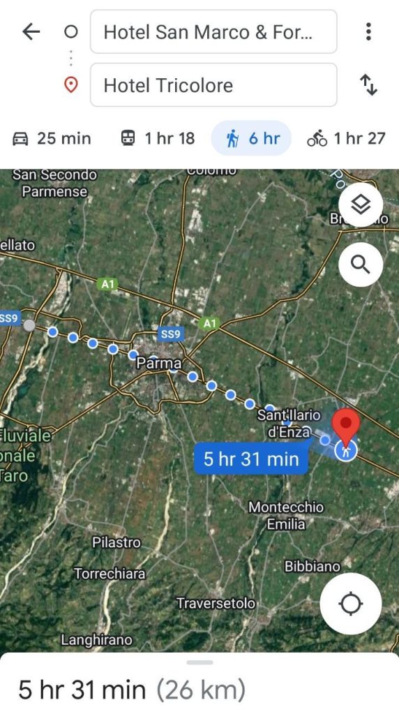 I arrived at the lodging around 2:30 today. Even though I spent my time leisurely observing the city of Parma, I arrived early. It’s the power of the dawn departure.