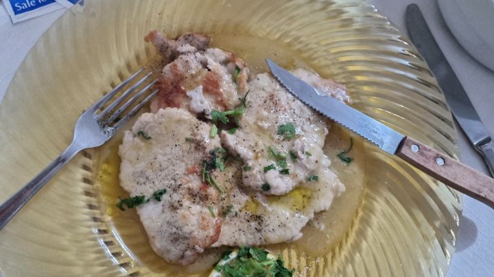 29. I ate deep-fried pork with lemon for a late lunch. It was flavorous with garlic sauce.