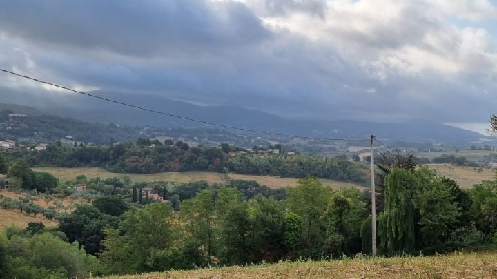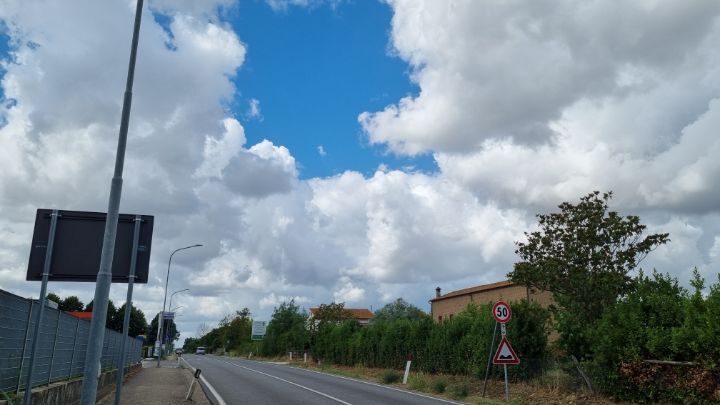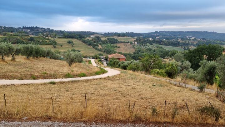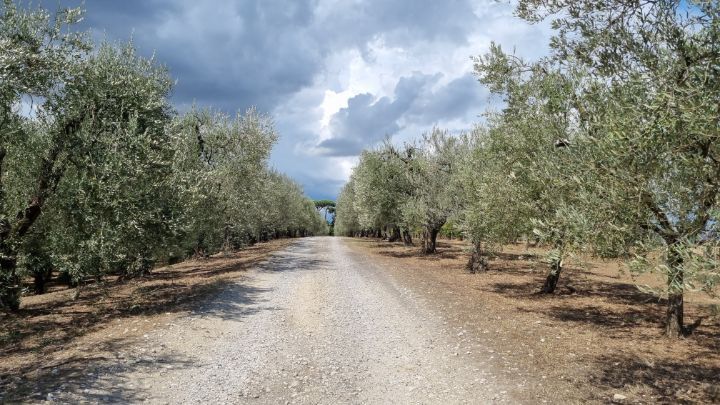 32. The olive trees along the road look quite old. The clouds that followed me all day look like watercolor.