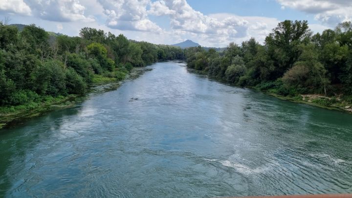 24. Downstream. It is not wide, but the water is clear and abundant. This river flows into the city of Rome.