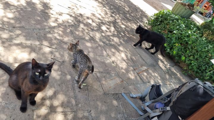 37. Fortunately, I can have lunch at the lodging that combines restaurant. The picture shows cats waiting for food given by customers in the lodging yard.