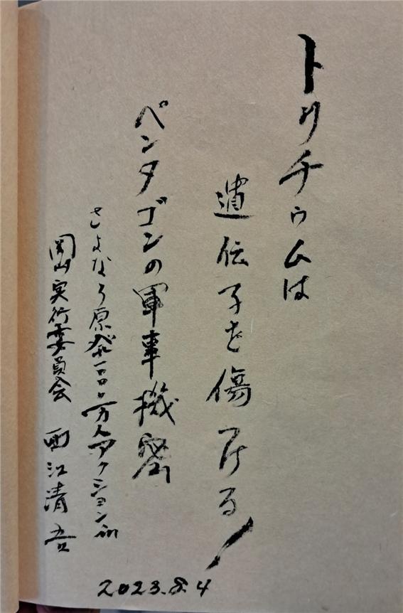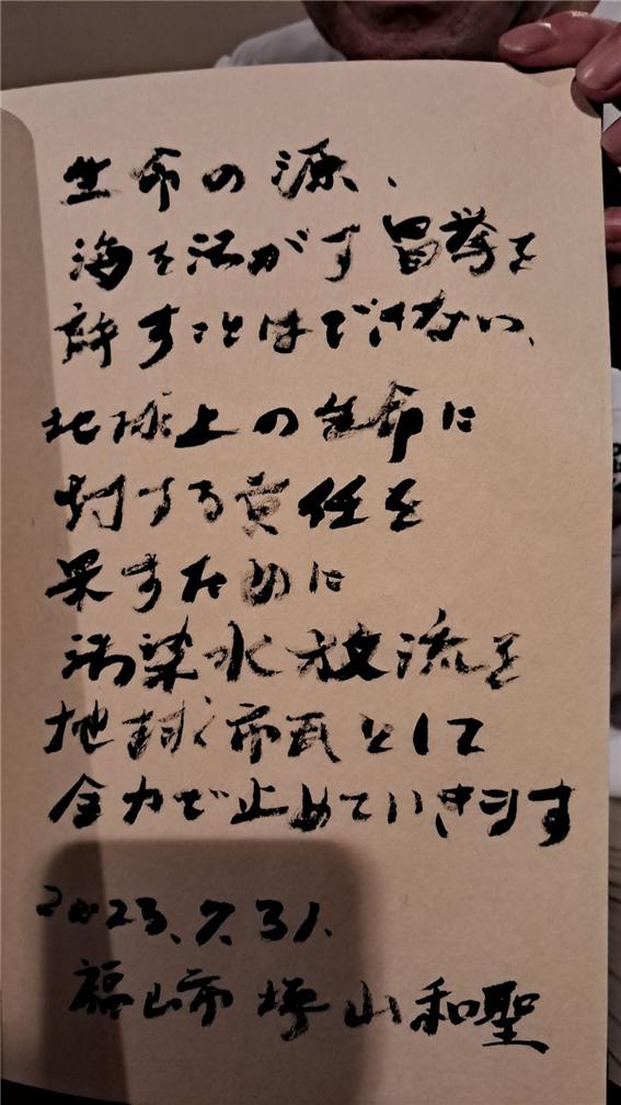 Let’s stop the discharge of polluted water with all our might as earth citizens in order to fulfill our responsibility for life on this planet earth.