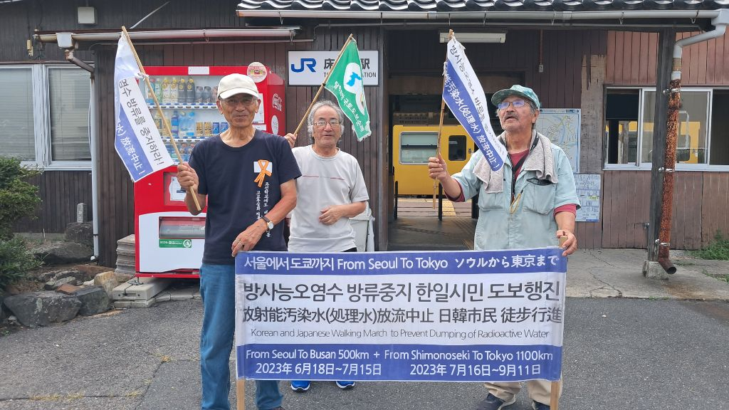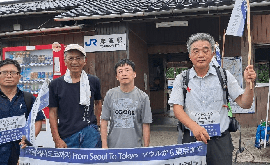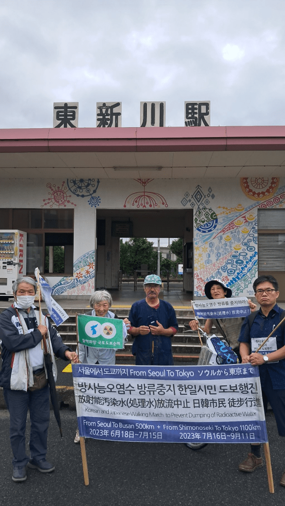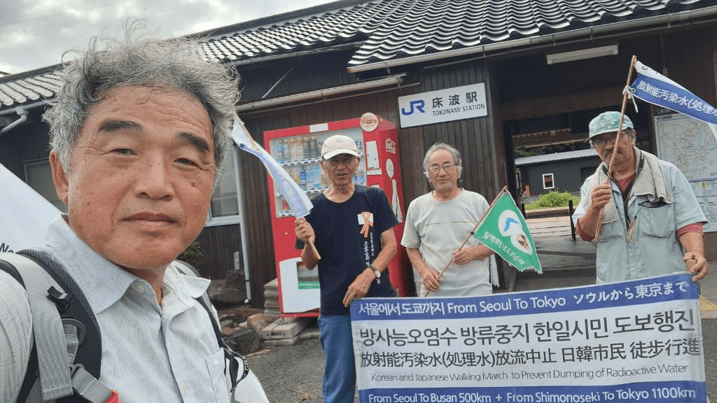 21. Comrade Jung Young Hoon standing on the platform. Although his time was short, he says he has a lot to write about. When he returns to Korea, he will continue to fight hard. By the time the marchers arrive in Tokyo, he intends to return to Japan.