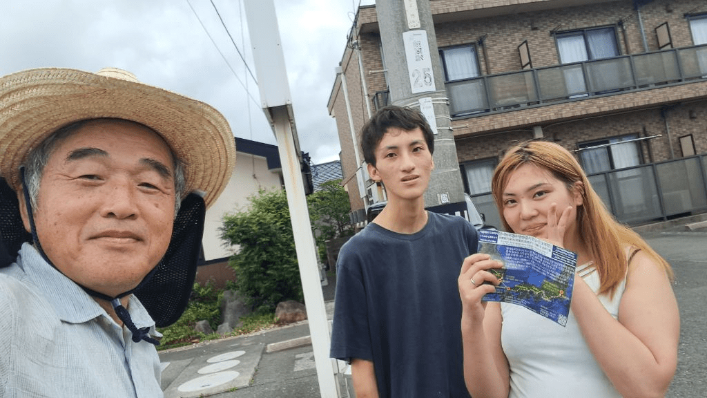 26. In the afternoon, three people see me off and I walk alone. The distance is 8.5km. Mr. Yasuhide Amagasaki, who is in the middle, gives me a suppot money.