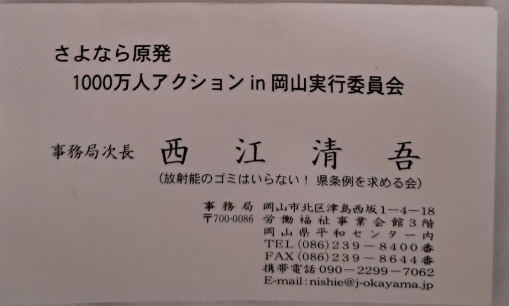 15. Deputy Secretary General of the Sayonara Nuclear Power Plant 10 Million People Action Okayama Executive Committee. At this time, I heard meaningful information from Nishi-san. The prefectural governor of Miyagi, who expressed his opposition to the discharge of contaminated water, was not that great person in the beginning. He said that he had no choice but to represent the will of the people in order to be elected in the next election. This is the point. It is an example that the governor can change his political choice at any time if the residents strongly appeal.