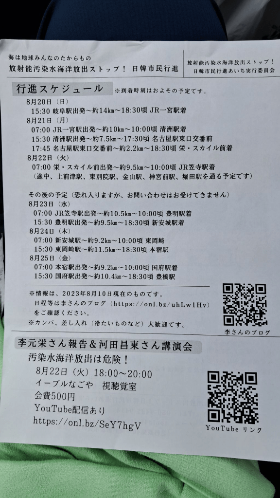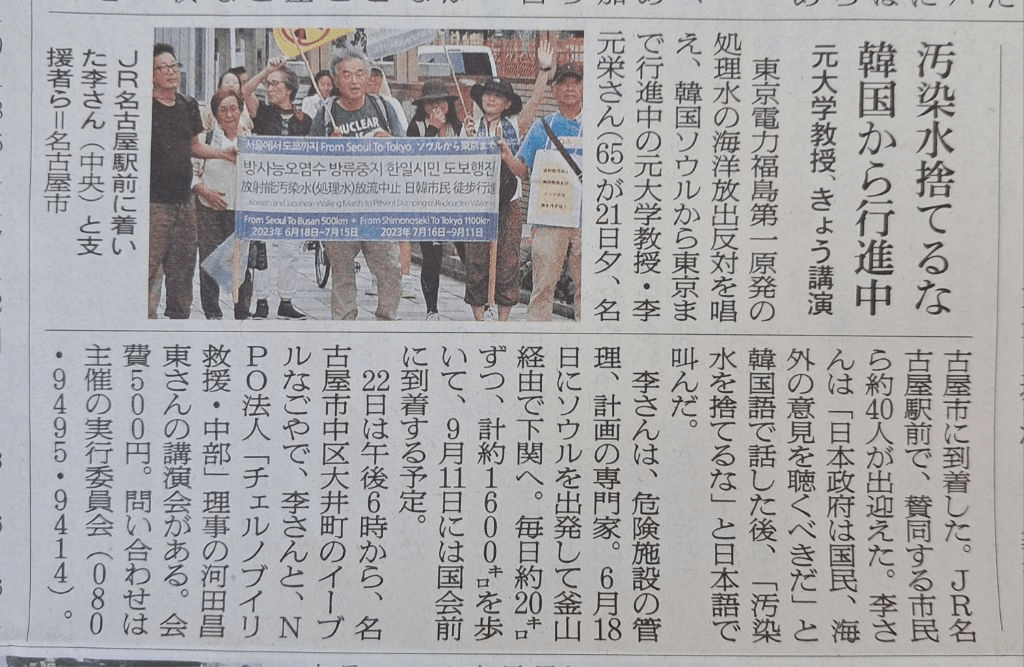 31. Many comrades are waiting for us when we arrive at our destination this afternoon, the Sakae district. At this time, I introduced the reporter’s second question and said as follows. “What motivates people is not persuasion based on knowledge and information, but by showing them through their own actions. Seeing the people sweating makes them think for themselves. There are two successful cases in South Korea. The march worked to lift the Samcheok nuclear power plant site that was designated 10 years ago. Regardless of whether it snowed or rained, the small number of citizens marched incessantly, and the public opinion of the residents who watched it grew and became stronger. That’s why it was successfully dedesignated a few years ago. Another success story was around 2016 when Busan marched to dismantle its aging nuclear power plant. After starting with a handful of citizens and continuing for more than half a year, the march has grown to hundreds of participants, and politicians from both the ruling and opposition parties gave up.”