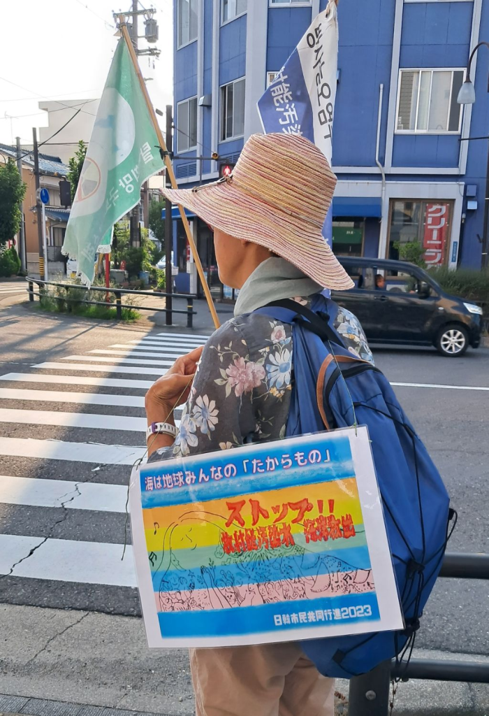 7. Wearing a placard made by comrades in Aichi Prefecture. Large letters are “Stop!! Discharge of Radioactive Water into the Sea”