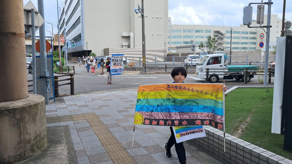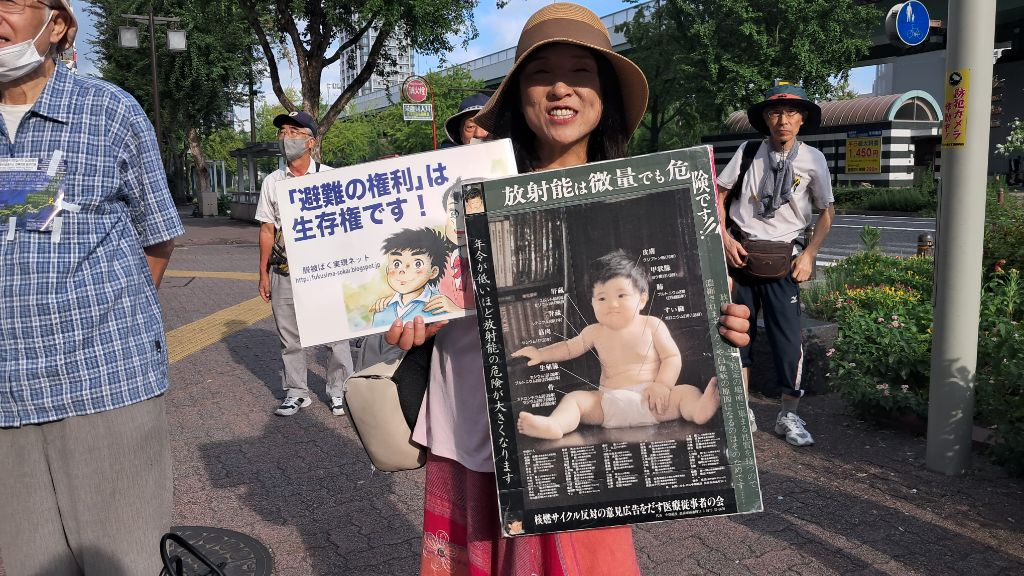 3. Yayoi Yoshida with a marching microphone comically mocks the release of contaminated water with a photo of a child.