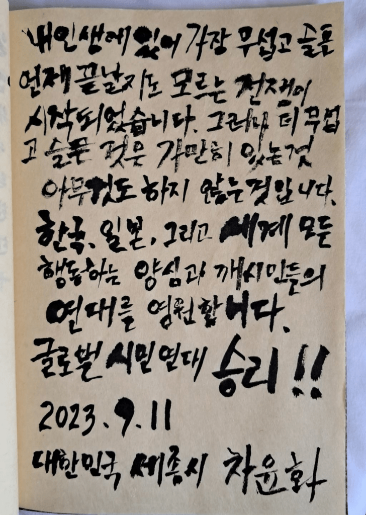 I hope for solidarity among all active consciences and awakened citizens in Korea, Japan, and around the world.