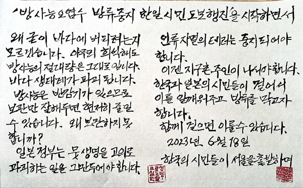 Just before starting this march, I contributed an article to the Hankyoreon called ‘Korea-Japan Citizens’ Walking March to Stop Radioactive Contaminated Water Discharge’. Its main parts are as follows,