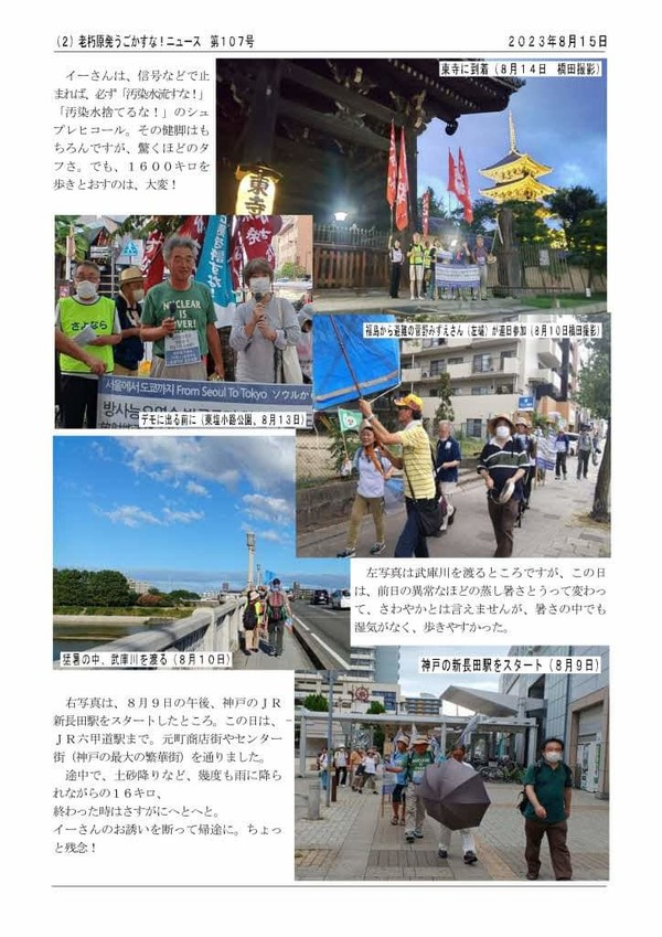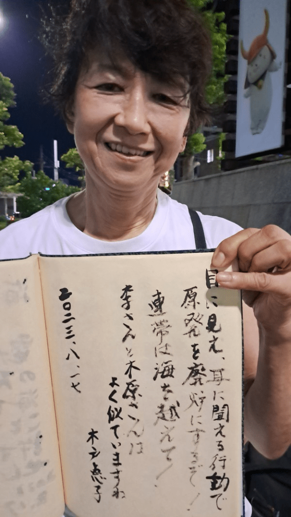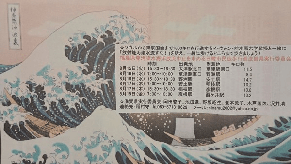 “Lee Won-young’s feat clearly had a huge impact on anti-nuclear power plant activists in Shiga Prefecture. This action to stop the discharge of contaminated water from nuclear power plants by walking 1,100 km across Japan, including Honshu, covering a total of 1,600 km, is in line with the spirit of our anti-nuclear power movement. It gave strength to the movement in Shiga Prefecture that has been shouting “Let’s protect Lake Biwa!” and “Let’s abolish nuclear power!” As 12 years and 5 months have passed since the Fukushima nuclear power plant accident, our actions have become manneristic and seem to be deteriorating over time. At this time, you taught us infinite vitality and softness. Thank you! Lee Won-young! Let’s stop the discharge of water together!! 2023.8.18. Korea-Japan walk demanding a stop to the discharge of contaminated water from the Fukushima nuclear power plant into the ocean. “March Shiga Prefecture Executive Committee”