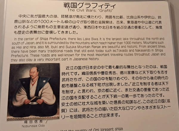 I met the famous Japanese general Oda Nobunaga. I visited an exhibition hall near Azuchi Castle, where he was based. Explanations within the exhibition hall explain the strategic importance of this area. By utilizing this area, Nobunaga put an end to the chaos of the Warring States Period and ushered in the dawn of the unification era.