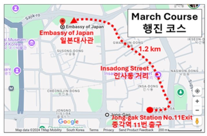 The gathering place is in front of Exit 11 of Jonggak Station on Line 1. We will walk along Insadong Street, shouting out messages, and after walking 1.2 km, we will arrive in front of the Japanese Embassy, where we will have a free speech. Any citizen of the world can participate.
