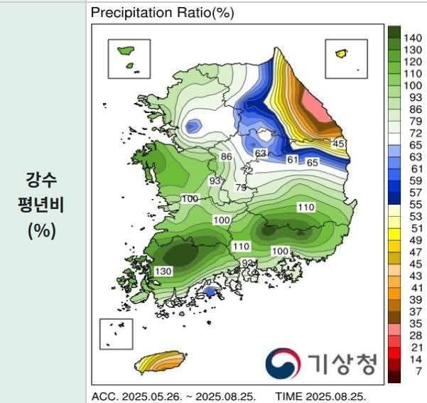 Figure 1. Rainfall from May to August of this year: Precipitation near Gangneung shows less than 35% of the annual average.