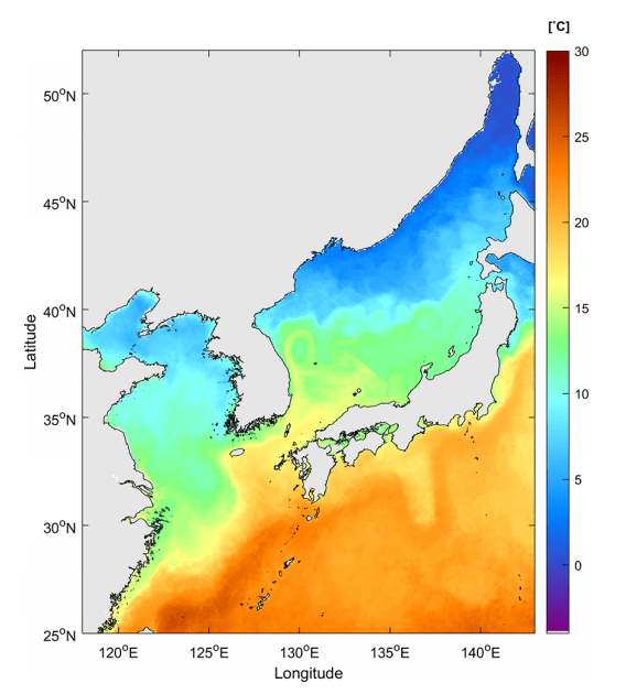 Figure 3. Satellite-observed water temperature in the waters of the Korean Peninsula (April 2023) (Lim Chae-young et al. 5 people, Sentinel-3 A/BSLSTR stratum sea surface temperature verification in coastal waters of the Korean Peninsula, re-applied by the Korea Geoscience Society, October 2024 issue)